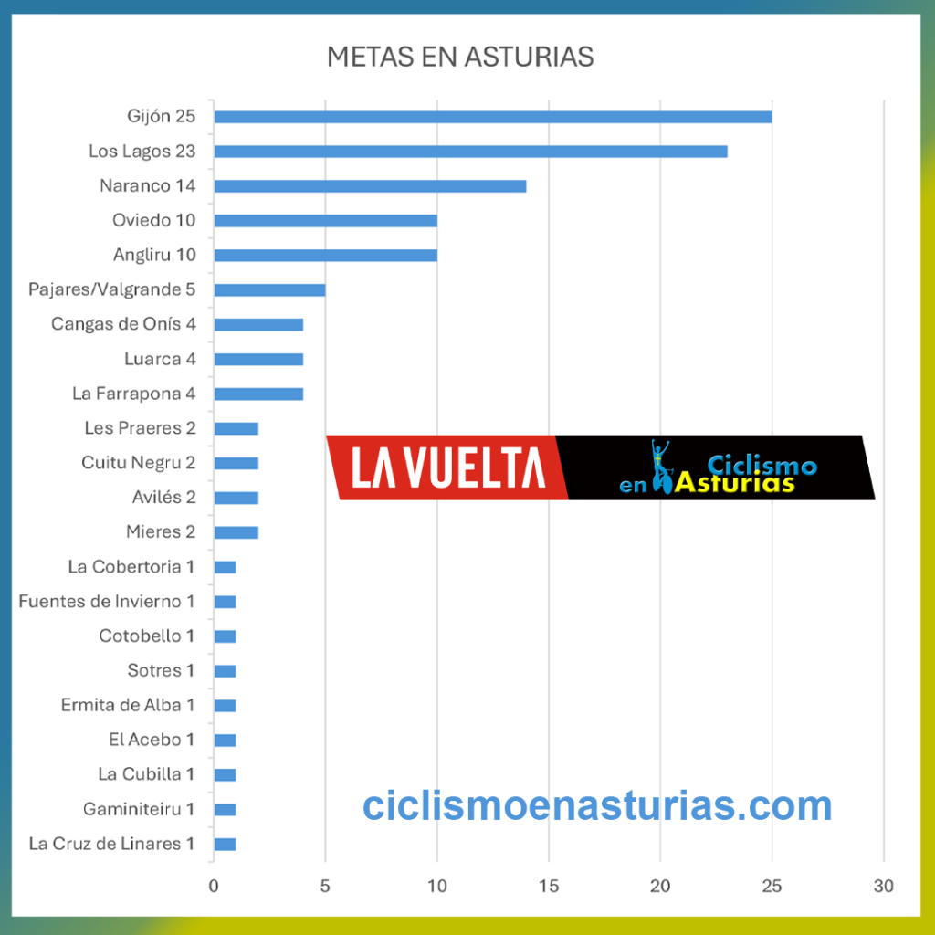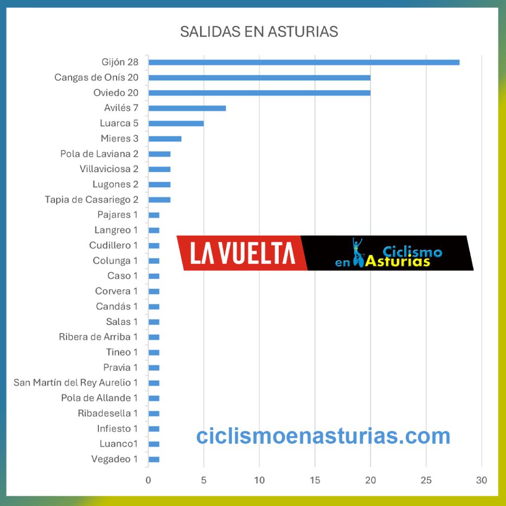 Hace 17 años que La Vuelta pasa por Asturias de forma ininterrumpida. Las montañas asturianas han sido lugar habitual para decidir quién se lleva el maillot rojo, sus icónicas cumbres como el Angliru hacen que sea un lugar de paso casi obligado en todas las ediciones de La Vuelta, en total 63 veces ha pasado por Asturias.