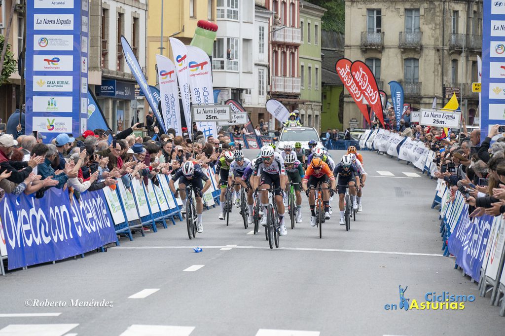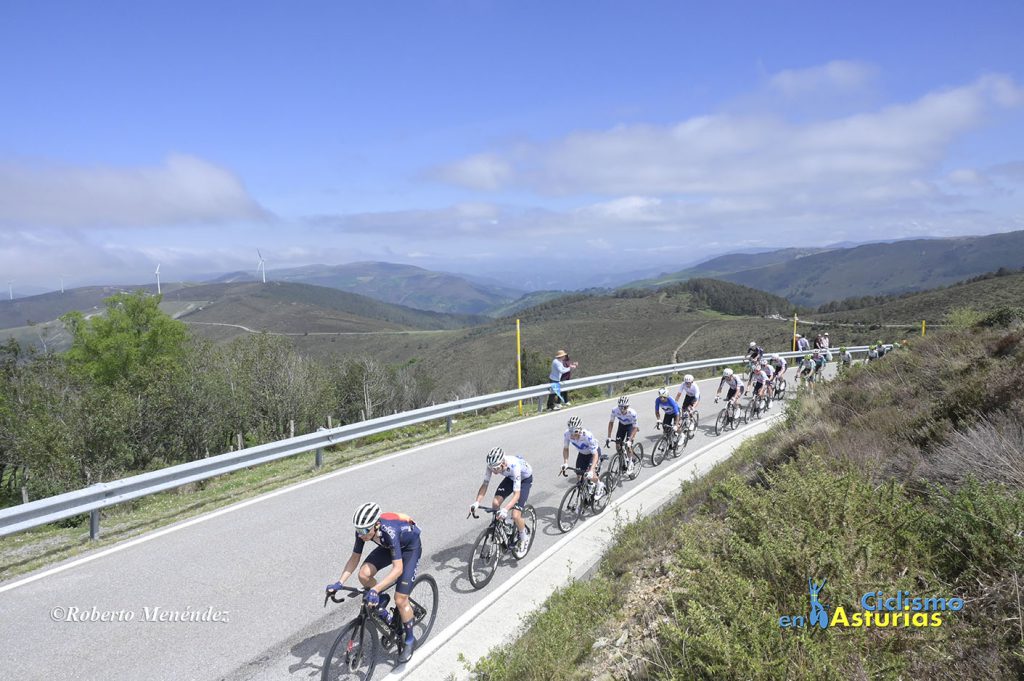 El alcalde de Castropol, Francisco Javier Vinjoy, fue el encargado de cortar la cinta en Figueras, para dar la salida de la tercera etapa de la ronda asturiana que constaba de 157 kilómetros y tenía dos puertos puntuables en su recorrido. En la subida al primero de ellos, el Alto de la Bobia, un grupo de siete corredores formó una escapada cuya máxima diferencia no alcanzó los tres minutos en ningún momento debido al trabajo de los equipos fuertes de la carrera, Movistar y UAE Emirates, que pusieron a sus corredores a trabajar para evitar que creciera la ventaja. Tras el paso por el alto, solo tres corredores consiguieron mantenerse en la fuga; Carlos García Pierna (Burgos Burpellet BH), Nil Gimeno (Kern Pharma) y Nicolás Alustiza (Euskaltel Euskadi) que pasaron por este orden por el alto de Orouso, última dificultad montañosa de la jornada.